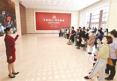 2021年中国共产党成立100周年前夕,中国共产党历史展览馆建成开放。图为在“不忘初心、牢记使命”中国共产党历史展览中,讲解员为前来参观的群众进行讲解。 |