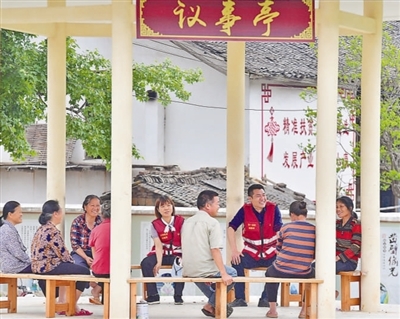 广西壮族自治区柳州市融安县大坡乡岗伟村驻村工作队员们在“议事亭”和村民们讨论村务工作。 |