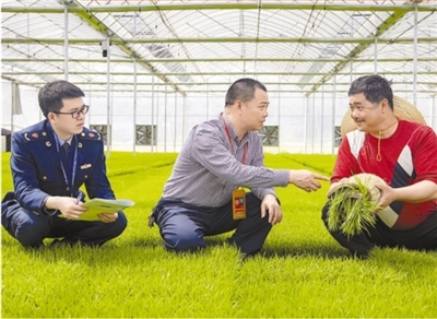 浙江省淳安县政协委员(中)和市场监管局工作人员(左)在汾口镇育秧基地走访农户,听取农户对区域农业品牌建设的意见建议。 |