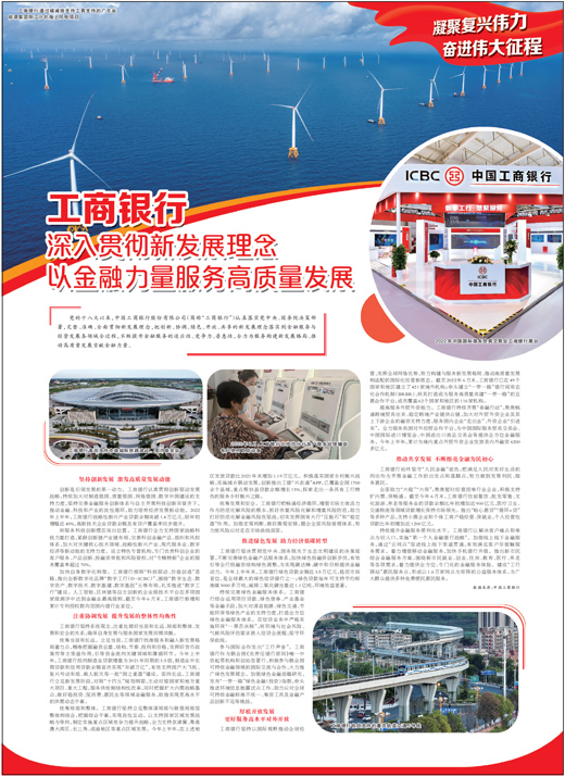 党的十八大以来,中国工商银行股份有限公司(简称“工商银行”)认真落实党中央、国务院决策部署,完整、准确、全面贯彻新发展理念,把创新、协调、绿色、开放、共享的新发展理念落实到金融服务与经营发展各领域全过程,不断提升金融服务的适应性、竞争力、普惠性,全力为服务构建新发展格局、推动高质量发展贡献金融力量。