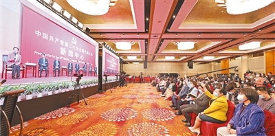 在党的二十大新闻中心第一场集体采访的分会场,记者举手提问。