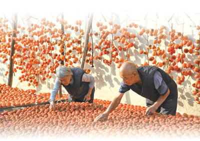 山西省永济市韩阳镇的柿子丰收,村民正在整理晾晒柿饼。 |