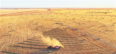 近年来,吉林省洮南市大面积推广“双季双优”种植模式,在盐碱地上种植冰麦和燕麦草,粮饲结合、一年两茬,实现了经济效益和生态效益的双赢。图为近日洮南市盛发农机专业合作社的收割机正在收割燕麦草。