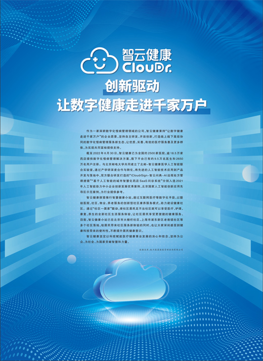 截至2022年6月30日,智云健康已为全国约2500家医院、逾18.5万家药店提供数字化慢病管理解决方案,旗下平台已有约9.5万名医生和2650万名用户注册。与北京邮电大学共同建立了北邮-智云健康医学人工智能联合实验室,通过产学研深度合作与转化,将先进的人工智能技术应用到产品开发与落地中,双方联合研发打造的“ICloudrSign-智云问典-AI远程处方管理透镜”“基于人工智能的城市智慧化药店SaaS问诊系统”分别入选2021年人工智能助力中小企业创新发展优秀案例、北京国家人工智能创新应用先导区示范案例,为行业提供参考。