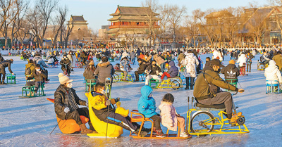 1月2日,北京什刹海冰场,游客在玩冰车。 |