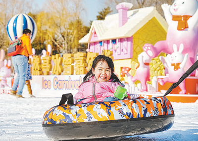 1月1日,游客在北京陶然亭冰雪嘉年华体验雪上飞碟。 |
