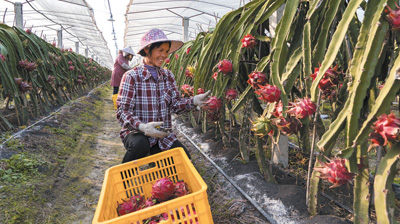 图为宾州镇顾明村种植基地里,村民正在采摘火龙果。