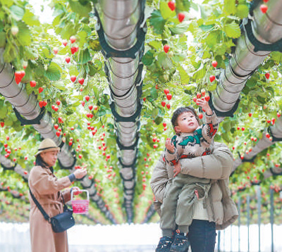 浙江省台州市黄岩区发展绿色农业,市民在一家草莓栽培基地里摘草莓。 |