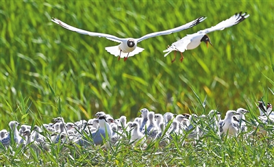 陕西省神木市红碱淖国家级自然保护区,遗鸥在岛上飞翔。 |
