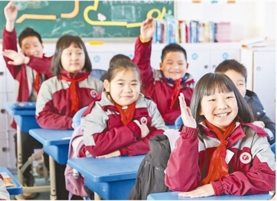 上海市松江区岳阳小学,同学们在课堂上纷纷举手回答老师的问题。