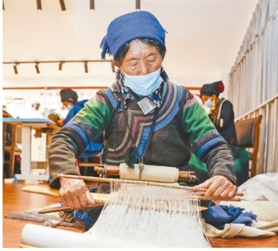 四川省凉山彝族自治州昭觉县南坪社区的彝绣工坊内,易地扶贫搬迁到此的妇女在纺织布匹,就近就业,实现稳定脱贫。
