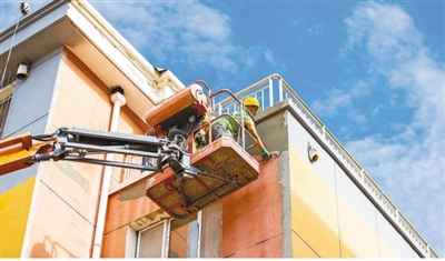 工人在内蒙古自治区呼和浩特市玉泉区石东路街道一老旧小区改造升级现场进行外墙真石漆施工作业。