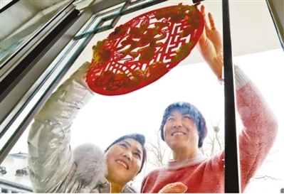 甘肃省张掖市临泽县鸭暖镇屯泉小镇彩蝶湾社区,刚刚迁进新居的村民在窗户上贴窗花。