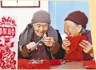 山东省日照市岚山区虎山镇黄家峪村养老服务中心,两位老人边剪纸边聊天。