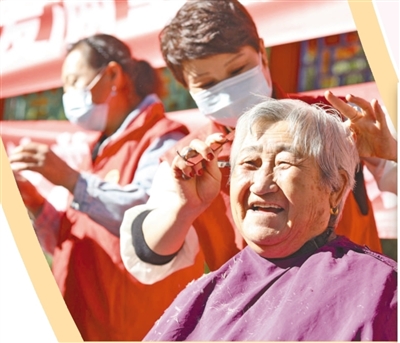 河北省唐山市丰润区燕山路街道欣园社区,志愿者为老人免费理发。