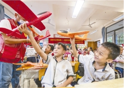 广西壮族自治区梧州市的一所小学内,学生正在上趣味航模科技课。 |