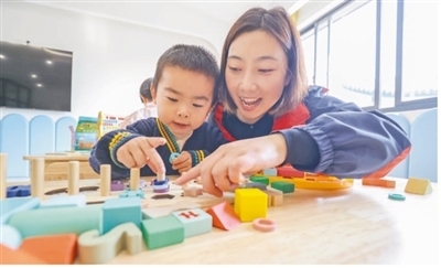 浙江省湖州市德清县阜溪街道兴山未来社区婴幼儿照护驿站,幼儿在志愿者指导下拼搭积木。 |