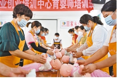 湖北省襄阳市保康县就业创业培训中心,学员在育婴师培训班上练习新生儿护理技能。 |