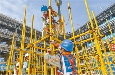 海南省建筑业职工职业技能竞赛暨质量安全现场观摩交流会现场,建筑工人正在进行架体搭设竞赛。 |