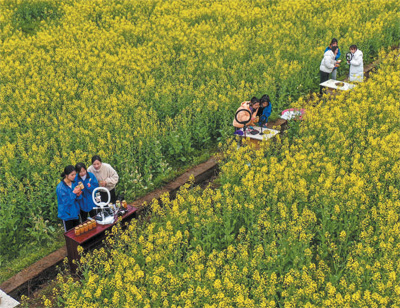 贵州岑巩县中等职业技术学校将实操课程搬进田间地头,学生在油菜花地里学习直播销售蜂蜜。 胡攀学摄(新华社发)