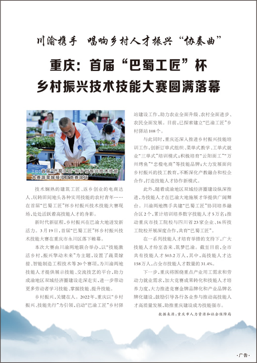 新时代新征程,乡村振兴在巴渝大地迸发新活力。3月19日,首届“巴蜀工匠”杯乡村振兴技术技能大赛在重庆市永川区落下帷幕。