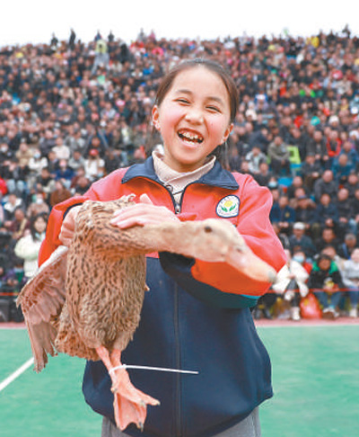 3月26日,一名小学生在贵州省首届“美丽乡村”篮球联赛总决赛赛前游戏环节中赢得奖品鸭子。 |