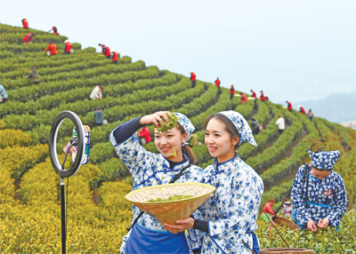 近日,浙江省台州市仙居县横溪镇进入采茶期,当地志愿者走进茶园,帮助茶农采摘茶叶、直播销售明前茶,拓宽市场、助力增收。