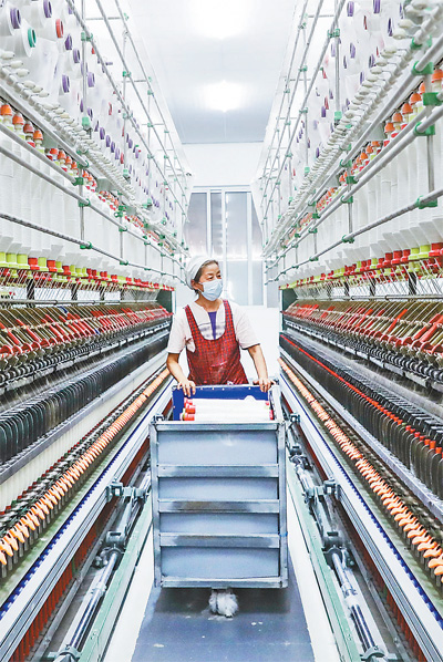 在江苏省淮安市苏嘴镇,工人在一家纺织企业的生产车间里作业。该企业带动近200人实现家门口就业。 赵启瑞摄(影像中国)