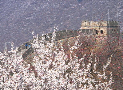 近来,在北京怀柔慕田峪长城景区内,山花绽放,吸引游客前来参观游览。目前景区内山花进入盛花期,花期预计持续到4月中下旬。
