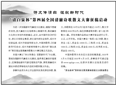 为进一步加强新时代廉洁文化建设,增强不想腐的自觉,放大廉洁文化培根净心铸魂作用,推动廉洁文化和文学创作深度融合,近日,由中国作协《诗刊》社、浙江日报报业集团、浙江省作家协会指导,绍兴市纪委监委、绍兴市委宣传部主办,中国诗歌网、《反腐败导刊》杂志、绍兴市新闻传媒中心承办的“清白泉杯”第四届全国清廉诗歌散文大赛征稿正式启动。