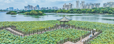 近日,广西南宁市南湖之滨,荷叶亭亭、荷香清幽。图为6月10日,游人在南湖之滨荷花池参观游览。