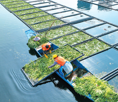 浙江省杭州市淳安县千岛湖镇坪山生态浮岛上,工作人员正在换种应季的水上蔬菜。 谢航凯摄(影像中国)