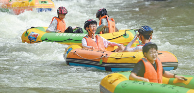 日前,2023年中国宜昌朝天吼自然水域漂流大赛举办,吸引了大量游客参与。据了解,从2012年开始,当地已举办了十届自然水域漂流大赛,年接待游客45万人次。图为游客正在进行漂流比赛。