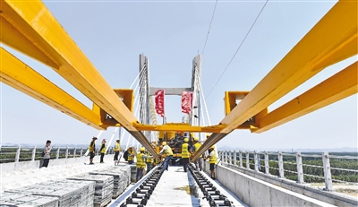 图为6月14日,在济郑高铁山东段长清黄河特大桥,中铁十局的工作人员正在进行铁轨铺设作业。