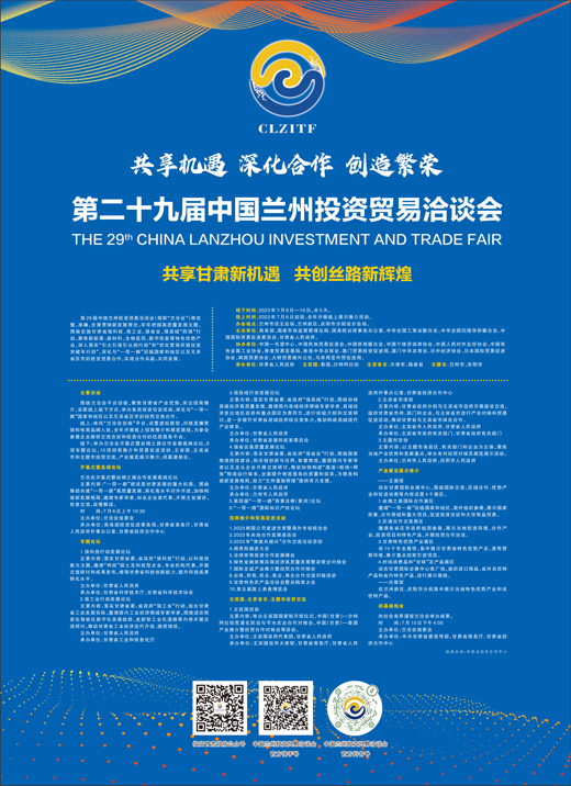 第29届中国兰州投资贸易洽谈会(简称“兰洽会”)将完整、准确、全面贯彻新发展理念,牢牢把握高质量发展主题,围绕实施甘肃省强科技、强工业、强省会、强县域“四强”行动,聚焦新能源、新材料、生物医药、数字信息等特色优势产业,深入落实“引大引强引头部行动”和“优化营商环境攻坚突破年行动”,深化与“一带一路”沿线国家和地区以及兄弟省区市的投资贸易合作,实现合作共赢、共同发展。