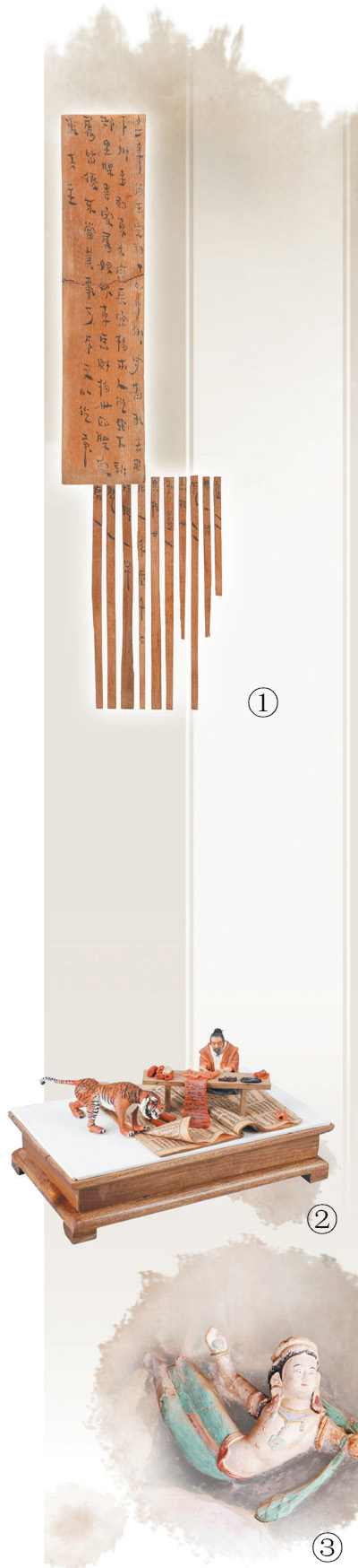 图①:修复后的汉简。 荆州文物保护中心供图 图②:郎佳子彧创作的面人作品《护书人伏生》。 施 芳供图 图③:金塔寺石窟里的悬塑飞天。 王锦涛供图