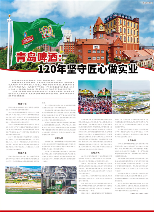 120年来,青岛啤酒参与推动中国啤酒行业从无到有、从有到大、从大到优、从优到精、从精到强的全过程,在不断满足人民群众对美好生活的需要中实现企业价值,为中国品牌的国际化提供了有益的探索经验。