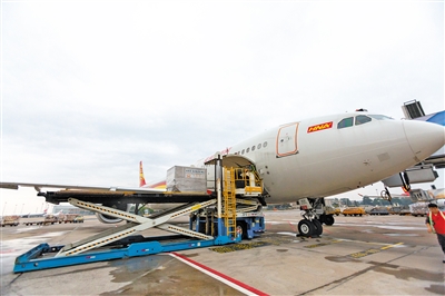 抵达北京首都国际机场的国际航班正在卸下进口鲜活货物。 |