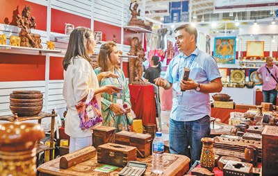 在本届南博会南亚馆,尼泊尔展区的参展商(右)在推介特色商品。 |
