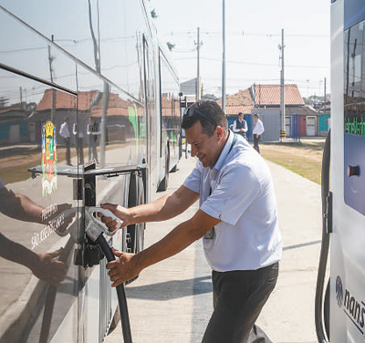巴西圣保罗州圣若泽杜斯坎普斯拥有该国首个纯电动城市快速公交系统。12台22米长的比亚迪纯电动铰链式大巴为该系统提供服务。图为当地工作人员在为比亚迪纯电动大巴充电。 |