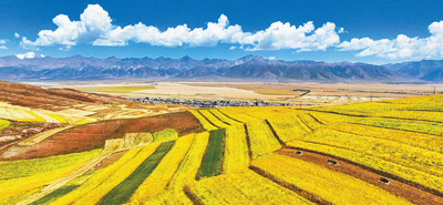 金秋时节,青海省海北藏族自治州门源回族自治县青石嘴镇,田间油菜金黄,呈现出丰收在望的景象。