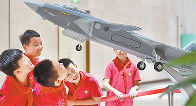 9月16日,河北省石家庄市开展了形式多样的全民国防教育日主题活动,教育引导群众学习国防知识,增强国防观念,弘扬爱国主义精神。图为学生们在石家庄解放纪念馆全民国防教育展室参观战斗机模型。