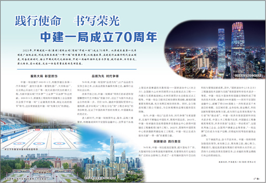 2023年,中国建筑一局(集团)有限公司(简称“中建一局”)成立70周年。从参建长春第一汽车制造厂扬帆启航,到成为服务共建“一带一路”的重要力量;从锐意改革、在建筑行业推行现代企业制度,到奋进新时代、踏上中国式现代化新征程,中建一局始终胸怀光荣与梦想,践行使命,书写荣光,薪火传承,匠心建造,交出一份高质量发展的亮丽答卷。