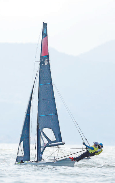 9月26日,帆船项目女子快速艇—49人FX级比赛,中国体育代表团选手胡晓宇/单梦缘(左)在比赛中。 |