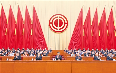 人民大会堂大礼堂气氛热烈。主席台上方悬挂着“中国工会第十八次全国代表大会”的会标,后幕正中象征着中国工会和中国工人阶级团结统一的工会会徽熠熠生辉,10面红旗分列两侧。二楼眺台悬挂着“坚持以习近平新时代中国特色社会主义思想为指导,全面贯彻党的二十大精神,组织动员亿万职工为全面建设社会主义现代化国家、全面推进中华民族伟大复兴团结奋斗!”的巨型横幅。