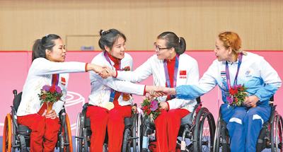 杭州亚残运会轮椅击剑女子花剑个人B级决赛,中国体育代表团运动员和泰国体育代表团运动员(右)在颁奖仪式上握手致意。 |