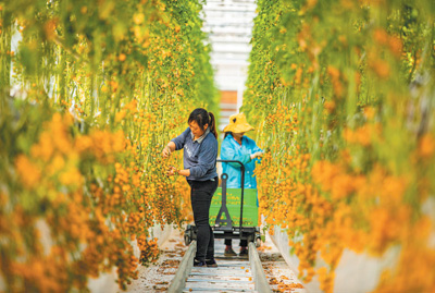 湖北省十堰市竹山县宝丰镇龙井村农业智慧园里,村民正在采摘圣女果。