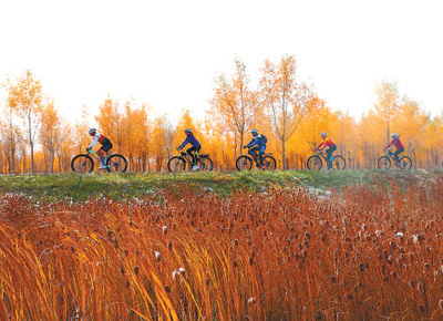 在甘肃省张掖市甘州区奥林匹克森林公园,骑行爱好者骑行游览,欣赏美丽胡杨林风光。