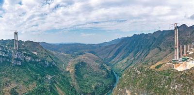 日前,贵州六安(六枝至安龙)高速公路的控制性工程——六安高速花江峡谷大桥两岸主塔顺利封顶,大桥关键性施工节点取得突破性进展。未来主塔相连,将形成主跨1420米的主桥。图为11月7日,花江峡谷大桥建设现场。
