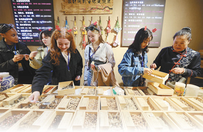 10月14日,在山东省临沂市沂南县铜井镇竹泉村,外国留学生在体验制作中药香囊。 |